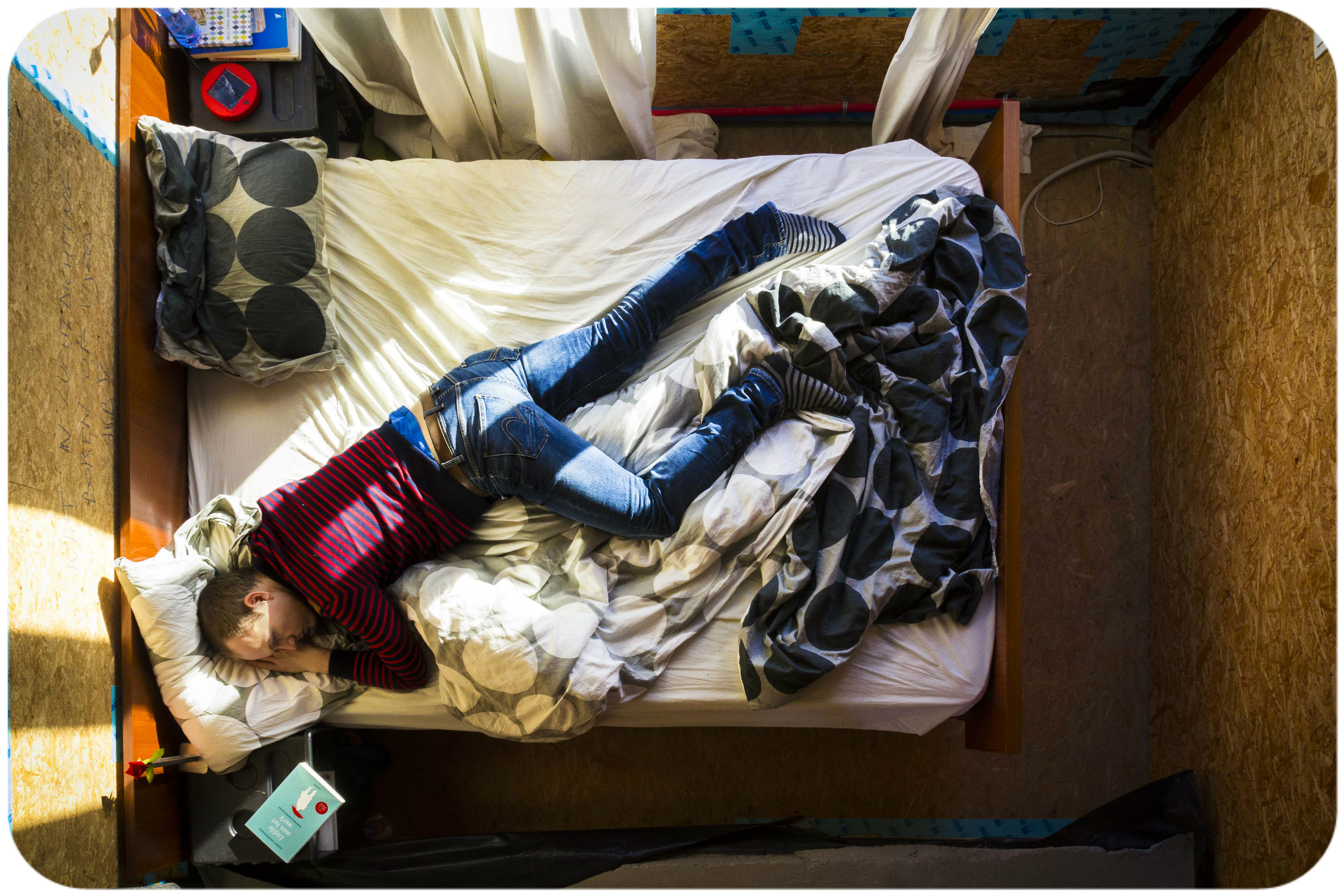Hoe je naar iets kijkt, bepaalt vaak hoe je over iets denkt. Soms bekijk je een situatie beter eens uit een verrassend standpunt. Vanop een andere hoogte. Een bredere context. Met een helikopterperspectief, zoals ze in marketingtermen zeggen. Of met een trapladderperspectief, zoals ik het deed. Je ziet plots meer dan iemand die in bed ligt. In een onafgewerkte bouwkamer. Waar een warme zon harde schaduwen werpt. Een roos op het nachtkastje. Geflaneerd door een boek van Alfons Vansteenwegen. Ik zou zeggen: lees zelf je verhaal! Ik schreef de foto voor mijn eindwerk fotoanalyse.