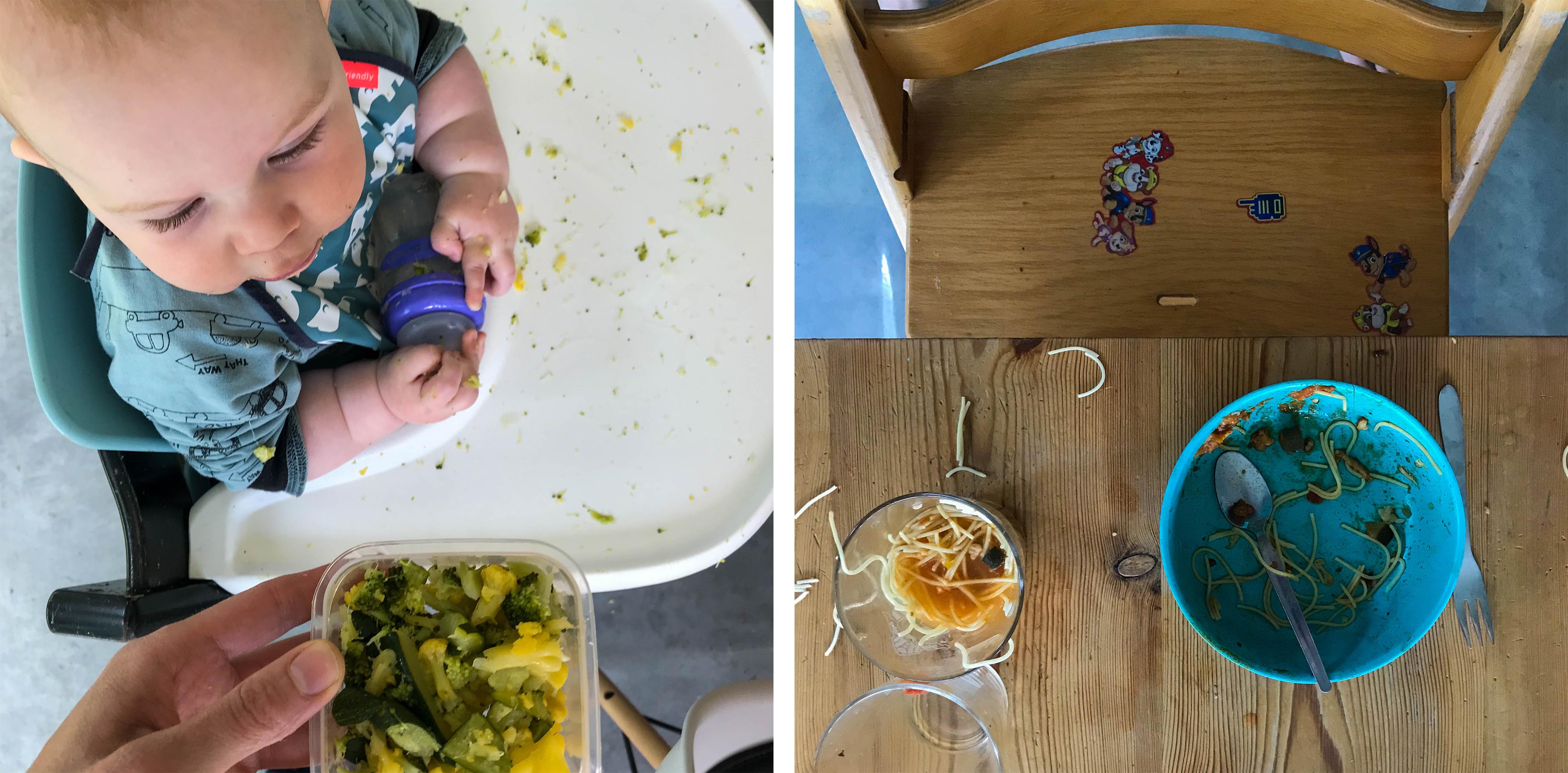 > Food for thought. Eten is zweten bij onze kleinste kastaar. Toch voor ons, want hij lepelt niet zomaar binnen wat hij krijgt voorgeschoteld. Hij wil vooral onderzoeken: grijpen, plat knijpen, uitwrijven en naar beneden keilen. Een interessante leer- experimenteerschool waarin we hem graag zelf laten ontdekken. Maar dat opkuiswerk (en de bijhorende frustratie) doet je wel soms twijfelen. ‘Het is maar voor eventjes’, zou je dan denken. Maar grote broer kan er ook nog wat van: sausen met spaghettislierten in zijn waterglas? Daarvoor draait hij zijn vuile handjes niet om. Het is vaak een moeilijke lijn tussen grenzen stellen en gezellig samen eten − Mon kan bijvoorbeeld heel moeilijk stil zitten en wij willen niet elk tafelmoment verpesten door daarover te zagen. Voor tips over eten en eetmomenten, schuif ik vaak mee aan de sociale tafel van Rolinde op de groei: een mama van drie en diëtiste/lactatiedeskundige met wetenschappelijk onderbouwde kennis over voeding (kwestie van te eindigen met een handige Instamomtip).