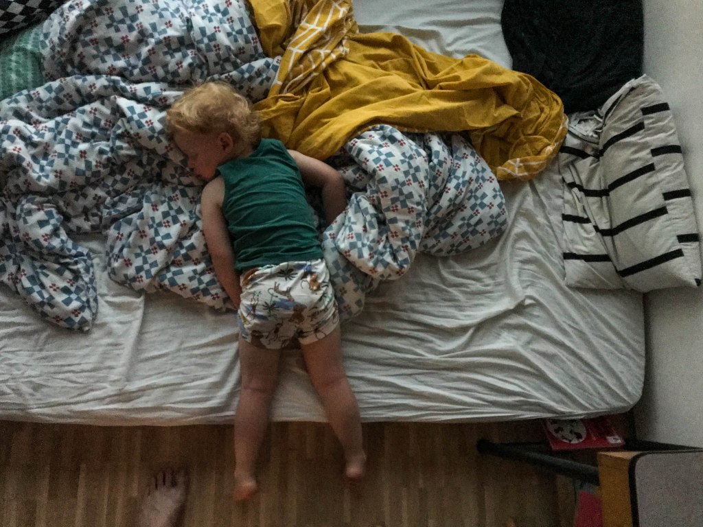 > In goede en woelige tijden. We kochten een nieuwe matras: de bioversie van Ikea. Nu slaapt Sven op onze oude tweepersoonsmatras met Mon. En ik op onze nieuwe, naast Sus (die al dan niet in zijn eigen bedje ligt). Elk apart op een kamer – nooit gedacht dat we dit zouden doen maar oververmoeidheid doet rare dingen met een koppel. Wel handiger om Mon nu in bed te steken, die tweepersoonsmatras. We blijven om beurt bij hem liggen tot hij slaapt. Eerst lezen we een verhaaltje − tegenwoordig zijn Jip en Janneke de favorieten. Daarna beantwoorden we nog een paar hersenkronkels zoals ‘Als mensen doodgaan, wordt er dan salami gemaakt van hun vlees?’, ‘Wat als er een dino komt?’, ‘Hebben botten ogen?’ en ‘Wat zijn die streepjes tussen jouw wenkbrauwen moeke?’ (rimpels jongen, van te weinig slaap dus ZWIJG – roept ze dan, in haar hoofd).