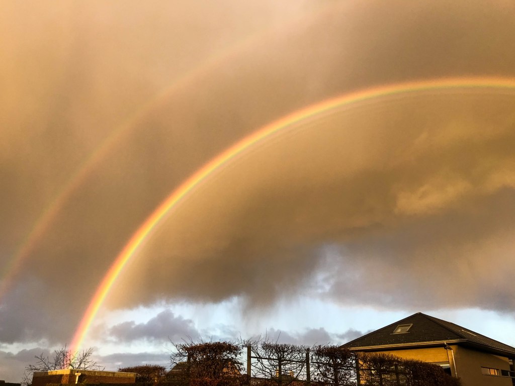 > Of we samen gingen kerstbubbelwandelen? Vroeg mijn moeder aan haar bende – lees: vier kinderen, twee schoonkinderen en vier kleinkinderen. Want we wilden toch samen iets doen, buiten, binnen de coronaregels. En wandelen is goed om te ontspannen. Ja tarara, niet voor deze (niet altijd zo zen) moeder. De oudste bombardeerde zijn loopfiets na drie keer duwen tot een loop-naar-de-hel-fiets, of zoiets. Hij weigerde nog een meter vooruit te gaan, terwijl de anderen een voorsprong namen in afstand én gezelligheid. Mon: ‘ik wil niet meer fietsen’. Ik: ‘ik zal je duwen’. Mon: ‘ik heb honger’. Ik: ‘als we wat verder zijn gaan we iets eten’. Mon: ‘ik heb dorst’. Ik: ‘hier is je drinkfles’. Mon: ‘mijn handen hebben koud’. Ik: ‘doe jouw handschoentjes aan’. Mon: ‘ik wil andere’. A-de-men, roept mijn hoofd! Maar ik voel het borrelen: een innerlijk vuurtje dat zijn handen snel zou warmen. Hij heeft een ontlading nodig, maar ik sta ook op de rand van een uitbarsting. Intussen zit de jongste in een trekzak, tegen zijn zin. Te koud gekleed, ontdekte mijn schuldgevoel te laat. Ook hij buldert het uit. Ze hebben mij nodig, alle twee, op dít moment. En ik voel het zelf stormen in mijn lijf. Het lukt niet om helder te denken. Er drummen zware wolken in mijn hoofd. Tot er geen plaats meer is om ze binnen te houden. Ze spatten uiteen in dikke druppels die langs mijn neus naar beneden glijden. Ze laten een warm spoortje troost achter. Door los te laten krijg ik weer wat grip. Door open te barsten kan er weer wat zonlicht door. Ik voel ruimte in mijn hoofd. Mijn gemoed en gebroed volgen, als vanzelf. De rest van de wandeling verloopt zeker niet perfect. Al schuilt er voor mij wel symboliek in: van koude wolken die de blauwe hemel kunnen verstoppen tot dubbele regenbogen die zich tussen de regendruppels kunnen ontpoppen. Alé, dat is achteraf natuurlijk gemakkelijk gezegd. Want in the heat of the moment voel ik het toch vaak onvoorspelbaar knetteren in mijn hoofd – waardoor mijn vriend soms fungeert als bliksemafleider, aangezien hij dan ‘de hoogste’ is van ons gezin (haha).