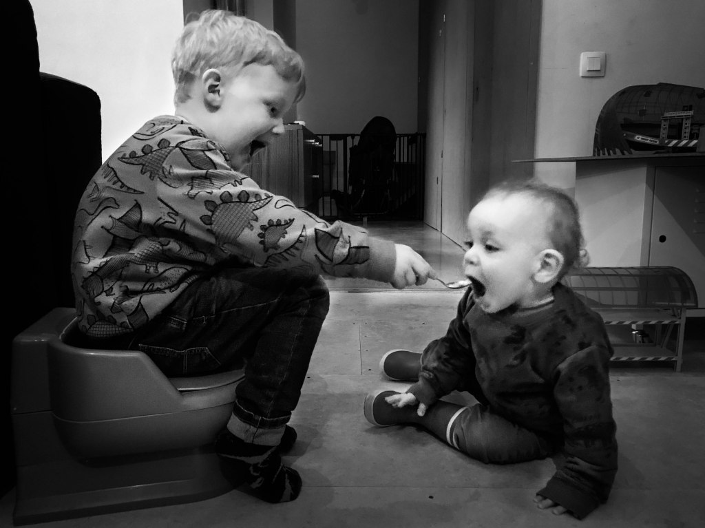 > Zijn grote broer is zijn grote voorbeeld. Alles doet hij na: van halsbrekende stunts (waarvoor Sus eigenlijk nog te klein is, zoals over de leuning van de zetel kruipen met zijn hoofd naar beneden) tot yoghurt uitsmeren op zijn cracotte (naar voorbeeld van grand chef Mon) en de moederlijke armen of schoot opeisen (terwijl ook Mon zijn lijf in de strijd gooit, lees: ruzie). Het is hartverwarmend om te zien, meestal toch. Twee broertjes die zo in verbinding staan, meestal toch. En dit imperfecte beeldje vat die perfecte momentjes mooi samen. Mijn hart werd zo week als het yoghurtbaardje onder een peutermond. Mon at yoghurt uit en op een potje – gelukkig niet hetzelfde. Kleine broer poepschuifelde voorzichtig dichter, maakte oogcontact en wachtte geduldig. Grote broer voelde de vraag in de lucht hangen en beantwoordde die met een (liefde)volle lepel. Toen vielen hun twee mondjes open (heerlijk, die spiegelneuronen), en tegelijk ook bijna de sluizen van mijn ogen. Ik kon nog net mijn gsm grijpen om mij achter te verstoppen een foto te nemen.