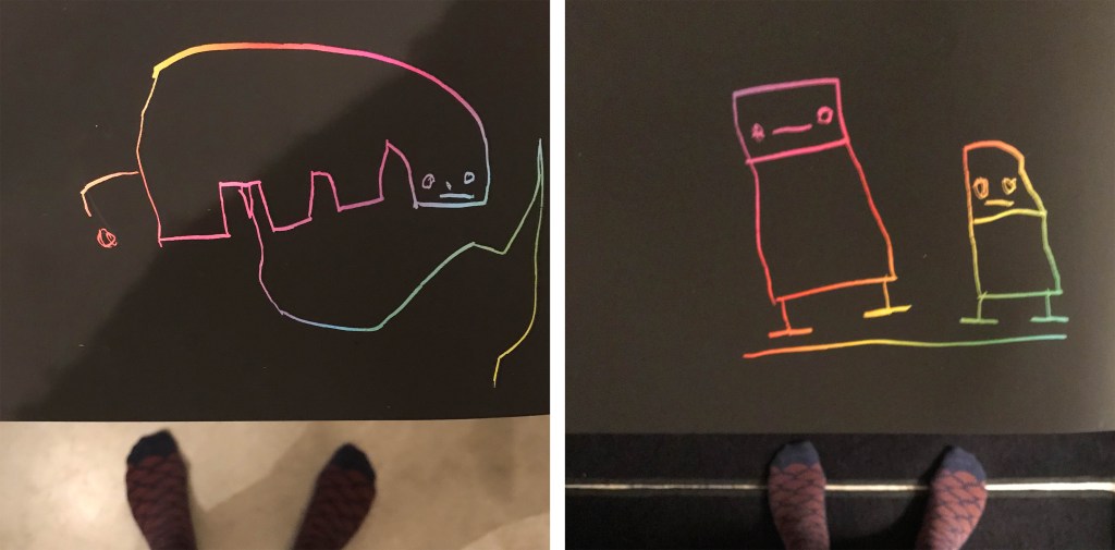 > Mon tekent. En zelfs dan blijft hij babbelen. Zijn kunstwerken: ‘een nijlpaard dat pipi en kaka doet’ en ‘meneertje peper en meneertje zout’. Wat hij nog meer van grappige dingen uitkraamde deze maanden? Hierzo: